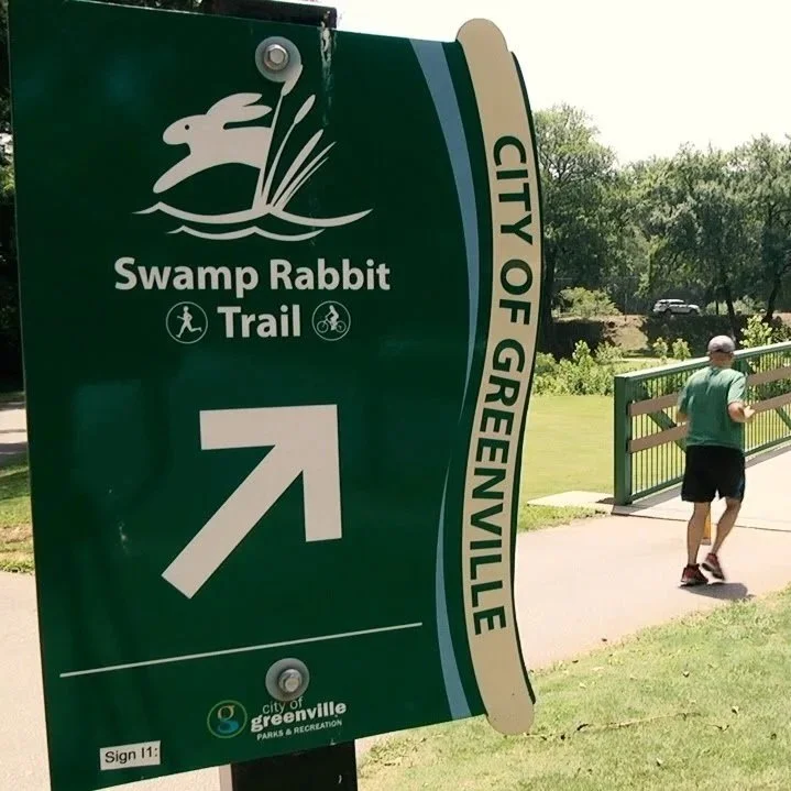The Swamp Rabbit Trail is a 28-mile multi-use greenway for walking and biking, running along the Reedy River and connecting Greenville to Travelers Rest.